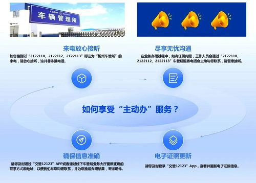 為了確保“主動(dòng)辦”服務(wù)的順利推進(jìn),忻州市公安局交警支隊(duì)還提醒用戶,請及時(shí)登錄“交管12123”App查看并更新電子證照信息,同時(shí)確保在車管所登記的聯(lián)系方式和地址準(zhǔn)確無誤。這樣,車管所不僅能夠及時(shí)與用戶溝通聯(lián)系,還能將辦理結(jié)果和證件準(zhǔn)確無誤地寄送到用戶手中。