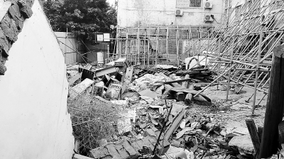 一節(jié)節(jié)鋼梁和木樁橫七豎八地堆在廢墟上,舊衣破被散落一地,已與凌亂的碎磚瓦一樣顏色,枯黃的蒿草更透著一股凄涼。幾十上百根黃色的鋼管密密匝匝地交織著,在僅有的堅固地面落腳,努力頂住93號院南側(cè)和西側(cè)的4層白色樓體。