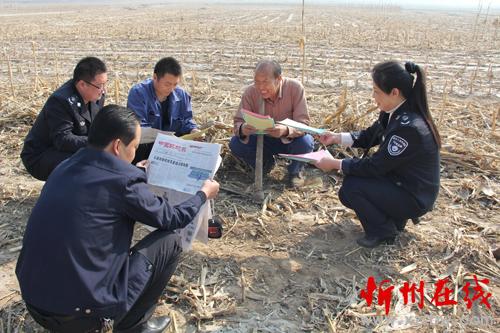 怎樣把《中華人民共和國大氣污染防治法》和《五臺縣人民政府嚴防森林火災的通告》宣傳到人?五臺縣環(huán)境保護局、環(huán)境監(jiān)察大隊分組劃片,組織環(huán)保人員深入到田間地頭,面對面讀報給農(nóng)民聽,手遞手散傳單讓農(nóng)民看,為農(nóng)民解釋燒秸稈、燒地堰、燒荒等野外違規(guī)用火行為的危害。臺城鎮(zhèn)西關(guān)村66歲的農(nóng)民張存在就高興地對縣環(huán)境監(jiān)察人員說:“你們這樣解釋,咱懂,“地頭環(huán)保”咱農(nóng)民也記得牢,我家4畝地的秸稈保證不燒一根,咱漚糞去,多打糧,又不污染?!眻D為地頭宣傳環(huán)境保護,增強農(nóng)民環(huán)保意識。(金俊賢 攝)