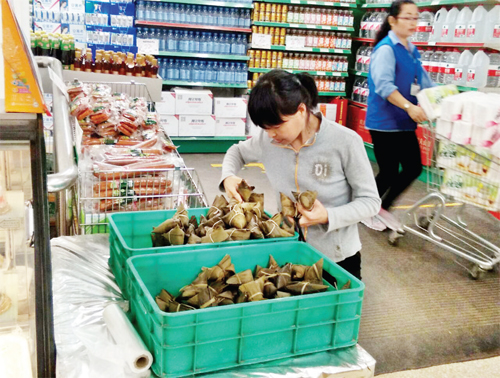 6月2日,市民在城區(qū)超市里買粽子、挑粽葉(張志遠 許凈 攝)
