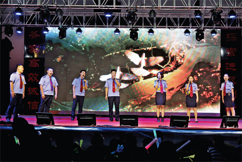 小合唱《今天是你的生日,我的祖國(guó)》演出現(xiàn)場(chǎng) 本報(bào)訊 沒有共產(chǎn)黨,就沒有新中國(guó)。為了紀(jì)念中國(guó)共產(chǎn)黨成立95周年,中國(guó)工農(nóng)紅軍長(zhǎng)征勝利80周年,廣泛宣傳黨的光輝業(yè)績(jī),忻州市保安押運(yùn)護(hù)衛(wèi)中心、忻州市保安服務(wù)公司在“七一”建黨節(jié)來臨之際,精心編排準(zhǔn)備了A、B、C三場(chǎng)文藝晚會(huì),分別于6月29日、30日、7月1日在其公司院內(nèi)演出,以這種方式表達(dá)他們對(duì)黨的熱愛和祝福。 這場(chǎng)以“頌歌獻(xiàn)給黨,共圓中國(guó)夢(mèng)”為主題的文藝晚會(huì),是保安押運(yùn)人精心組織,自編、自導(dǎo)、自演的一臺(tái)節(jié)目,就像該公司黨委書記陳志平所說:“這場(chǎng)文藝晚會(huì)是我們保安押運(yùn)人向黨95歲華誕獻(xiàn)上的頌歌?!?月29日第一場(chǎng)晚會(huì)于晚8時(shí)正式上演,晚上7時(shí)便有觀眾陸續(xù)來到演出現(xiàn)場(chǎng)。第一場(chǎng)晚會(huì)就讓觀眾大呼過癮,節(jié)目形式多樣,有小合唱、獨(dú)唱、配樂詩朗誦、舞蹈、雙簧、小品、服裝秀等。其中舞蹈《映山紅》、男生獨(dú)唱《紅旗飄飄》、電聲樂隊(duì)《閃閃的紅星》歌曲串燒等用不同的藝術(shù)形式表現(xiàn)了保安押運(yùn)人對(duì)黨和祖國(guó)的熱愛之情,感染了現(xiàn)場(chǎng)的觀眾;而雙簧表演《文武雙全》將晚會(huì)現(xiàn)場(chǎng)氣氛推向高潮,兩位表演者夸張的表情、搞笑的扮相引得觀眾連連叫好。 小合唱《今天是你的生日,我的祖國(guó)》參演人員、特勤大隊(duì)逯沛鑫告訴記者,節(jié)目是他們利用工作以外的時(shí)間自己排練的,準(zhǔn)備了將近有一個(gè)月,希望能出一份力,表達(dá)一份情?,F(xiàn)場(chǎng)觀眾王女士說:“沒想到晚會(huì)這么精彩,從音響設(shè)備、燈光舞美到表演人員,都很出色,感覺一點(diǎn)兒都不比專業(yè)晚會(huì)差,很期待另外兩場(chǎng)晚會(huì)的演出?!?/p> 忻州市保安服務(wù)公司經(jīng)過十余年的發(fā)展,現(xiàn)已擁有2000余名員工,200多輛業(yè)務(wù)車輛,年?duì)I業(yè)額突破億元,22支專業(yè)武裝守押隊(duì)伍服務(wù)于忻州14個(gè)縣(市)金融單位,55支保安服務(wù)隊(duì)伍服務(wù)于全市50多家企事業(yè)單位,負(fù)責(zé)企事業(yè)單位、金融保險(xiǎn)機(jī)構(gòu)等的保衛(wèi)、巡邏;貨幣、有價(jià)證券等貴重物品和危險(xiǎn)品的守護(hù)、聯(lián)網(wǎng)報(bào)警、技術(shù)防范等安全保衛(wèi)工作。該公司是我市唯一一支專業(yè)擔(dān)任金融系統(tǒng)武裝守護(hù)、押運(yùn)、夜間安全巡查任務(wù)的專業(yè)性企業(yè)。(張志遠(yuǎn) 許凈 攝影報(bào)道) (責(zé)任編輯:李冬梅) |