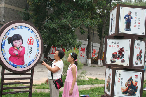 7月18日,原平市的家長(zhǎng)正在忠孝園圖文并茂的宣傳圖畫前給孩子講解。該市通過多種形式的方法宣傳忠孝文化,讓市民們更加了解其傳統(tǒng)孝文化的內(nèi)涵和傳統(tǒng)美德,代代相傳,煥發(fā)起人們更加熱愛祖國(guó)和熱愛人民。(趙春曉 攝)
