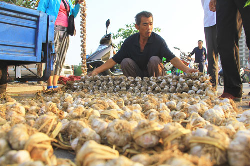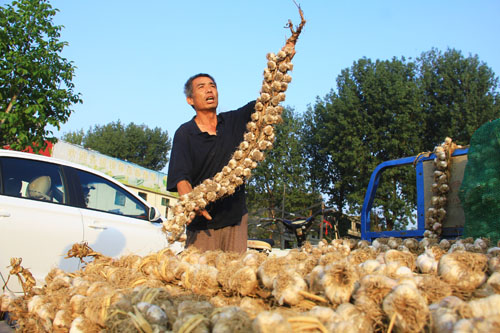 7月30日,原平市陽房村蒜農(nóng)正在農(nóng)產(chǎn)品市場銷售紫皮蒜。原平紫皮蒜是當(dāng)?shù)氐钠放妻r(nóng)產(chǎn)品,盛產(chǎn)于滹沱河沿岸的新原鄉(xiāng)和西鎮(zhèn)鄉(xiāng),不僅是調(diào)味佳品,而且食用具有藥用價(jià)值,省內(nèi)外客商慕名而來購買,深受歡迎。(吉建平 攝)