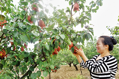 走進(jìn)梨園,記者看到,一排排梨樹(shù)枝粗葉茂,大大小小的套袋酥梨掛滿(mǎn)了枝頭,等待著人們的采摘?!耙郧熬褪敲考矣心敲磶卓脴?shù),零零散散不成氣候?,F(xiàn)在形成了規(guī)模化種植,在市場(chǎng)上也打出了品牌?!蓖跫t麗指了指周邊一眼看不到盡頭的梨園,介紹說(shuō)這都是同村的村民種植的。為了符合人們現(xiàn)在純天然、綠色、無(wú)污染的消費(fèi)需求,所有的梨在剛成形時(shí)就被套上了袋子,不再打農(nóng)藥?!艾F(xiàn)在各家各戶(hù)都開(kāi)始采摘了,再過(guò)幾天,就會(huì)有各地來(lái)的經(jīng)銷(xiāo)商統(tǒng)一收購(gòu)。”