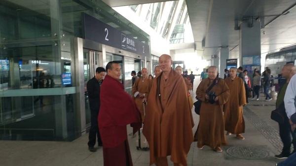 圖為五臺山望海寺住持釋覺一法師與弟子們順利到達(dá)西寧機(jī)場,木蘭加措法師前往迎接。