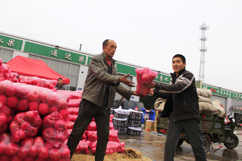 10月23日,原平市果農正在德金城農產品交易市場卸貨,進行銷售。原平市著力打通農產品銷售渠道,通過創(chuàng)建市場、加強管理,將當?shù)剞r產品規(guī)范到統(tǒng)一銷售場所,抱團銷售農產品,不僅方便了消費者,而且便于走出去,打造知名品牌。(吉建平 攝)