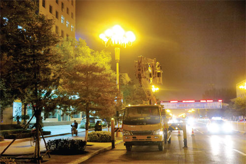 路燈檢修工人穿好工作服,戴上安全帽,登上搶修車的工作臺,對路燈、接線箱、燈桿等照明設(shè)施進(jìn)行了全面細(xì)致的檢查、維護、更換。10月26日9時許,記者在我市城區(qū)長征路上看到,市政公司組織工人冒著凜冽的寒風(fēng),正在對道路兩旁損壞的路燈進(jìn)行更換,確保夜幕下城區(qū)的每一盞路燈都能夠正常照明。圖為工人師傅正在長征路上對損壞的路燈進(jìn)行更換。(張志遠(yuǎn) 王菲 攝)