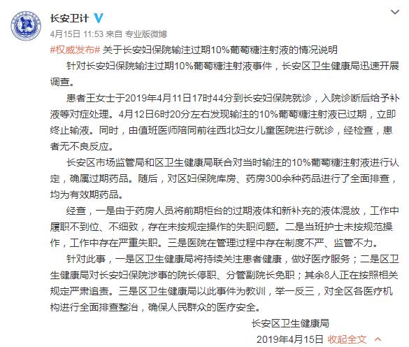 人民網(wǎng)北京4月15日電 據(jù)西安市長(zhǎng)安區(qū)衛(wèi)生和計(jì)劃生育局官網(wǎng)微博消息,針對(duì)長(zhǎng)安婦保院輸注過(guò)期10%葡萄糖注射液事件,長(zhǎng)安區(qū)衛(wèi)生健康局迅速開展調(diào)查。 患者王女士于2019年4月11日17時(shí)44分到長(zhǎng)安婦保院就診,入院診斷后給予補(bǔ)液等對(duì)癥處理。4月12日6時(shí)20分左右發(fā)現(xiàn)輸注的10%葡萄糖注射液已過(guò)期,立即終止輸液。同時(shí),由值班醫(yī)師陪同前往西北婦女兒童醫(yī)院進(jìn)行就診,經(jīng)檢查,患者無(wú)不良反應(yīng)。 長(zhǎng)安區(qū)市場(chǎng)監(jiān)管局和區(qū)衛(wèi)生健康局聯(lián)合對(duì)當(dāng)時(shí)輸注的10%葡萄糖注射液進(jìn)行認(rèn)定,確屬過(guò)期藥品。隨后,對(duì)區(qū)婦保院庫(kù)房、藥房300余種藥品進(jìn)行了全面排查,均為有效期藥品。 經(jīng)查,一是由于藥房人員將前期柜臺(tái)的過(guò)期液體和新補(bǔ)充的液體混放,工作中履職不到位、不細(xì)致,存在未按規(guī)定操作的失職問(wèn)題。二是當(dāng)班護(hù)士未按規(guī)范操作,工作中存在嚴(yán)重失職。三是醫(yī)院在管理過(guò)程中存在制度不嚴(yán)、監(jiān)管不力。 針對(duì)此事,一是區(qū)衛(wèi)生健康局將持續(xù)關(guān)注患者健康,做好醫(yī)療服務(wù);二是區(qū)衛(wèi)生健康局對(duì)長(zhǎng)安婦保院涉事的院長(zhǎng)停職、分管副院長(zhǎng)免職;其余8人正在按照相關(guān)規(guī)定嚴(yán)肅追責(zé)。三是區(qū)衛(wèi)生健康局以此事件為教訓(xùn),舉一反三,對(duì)全區(qū)各醫(yī)療機(jī)構(gòu)進(jìn)行全面排查整治,確保人民群眾的醫(yī)療安全。
