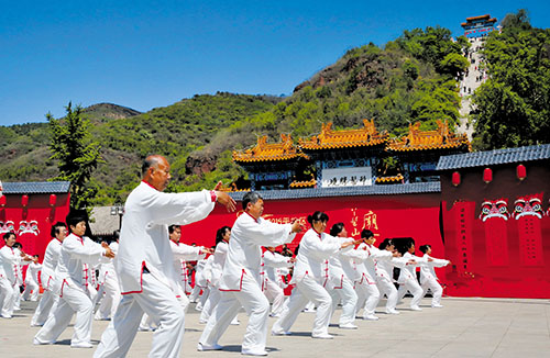 5月5日,北京平谷區(qū)劉家店鎮(zhèn)舉辦丫髻山第三十屆休閑文化廟會(huì),開展威風(fēng)鑼鼓、秧歌花會(huì)、百人太極等表演活動(dòng)和書法雅集、文創(chuàng)展示等文化活動(dòng),吸引大批來(lái)自京津冀地區(qū)的游人參加。圖為劉家店鎮(zhèn)的老年人在文化廟會(huì)上表演太極拳。新華社記者 李欣 攝 (責(zé)任編輯:盧相?。?/p> |