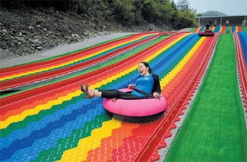 湖北省恩施土家族苗族自治州宣恩縣沙道溝鎮(zhèn)二臺坪村是個三面臨崖的高山鄉(xiāng)村,在實施精準扶貧過程中,于2018年修通了進村水泥路。隨著交通條件的改善,當?shù)卮迕衤?lián)合成立旅游經(jīng)營公司,推進以綠色生態(tài)為底色的“多彩鄉(xiāng)村游”,讓昔日沉寂的鄉(xiāng)村變得多姿多彩。圖為5月13日,游客在湖北省宣恩縣二臺坪村的游樂場體驗滑草樂趣。