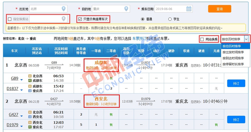 2、換乘過程中,存在同站換乘和不同車站換乘兩種情況。在列車余票信息頁面,旅客可根據需求,對“指定換乘站”“只顯示有座席車次”“同站換乘”等信息進行勾選。此外,車票信息還可以根據總歷時、出發(fā)、到達、停留時間進行排序。