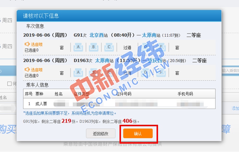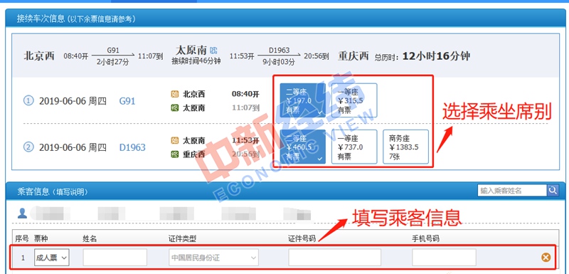 4、一切準備就緒后,就可進行車票預訂了。點擊“預訂”后,系統(tǒng)會再次對換乘信息進行提示,確認無誤后選擇對應車次所需席別,添加乘車人信息。