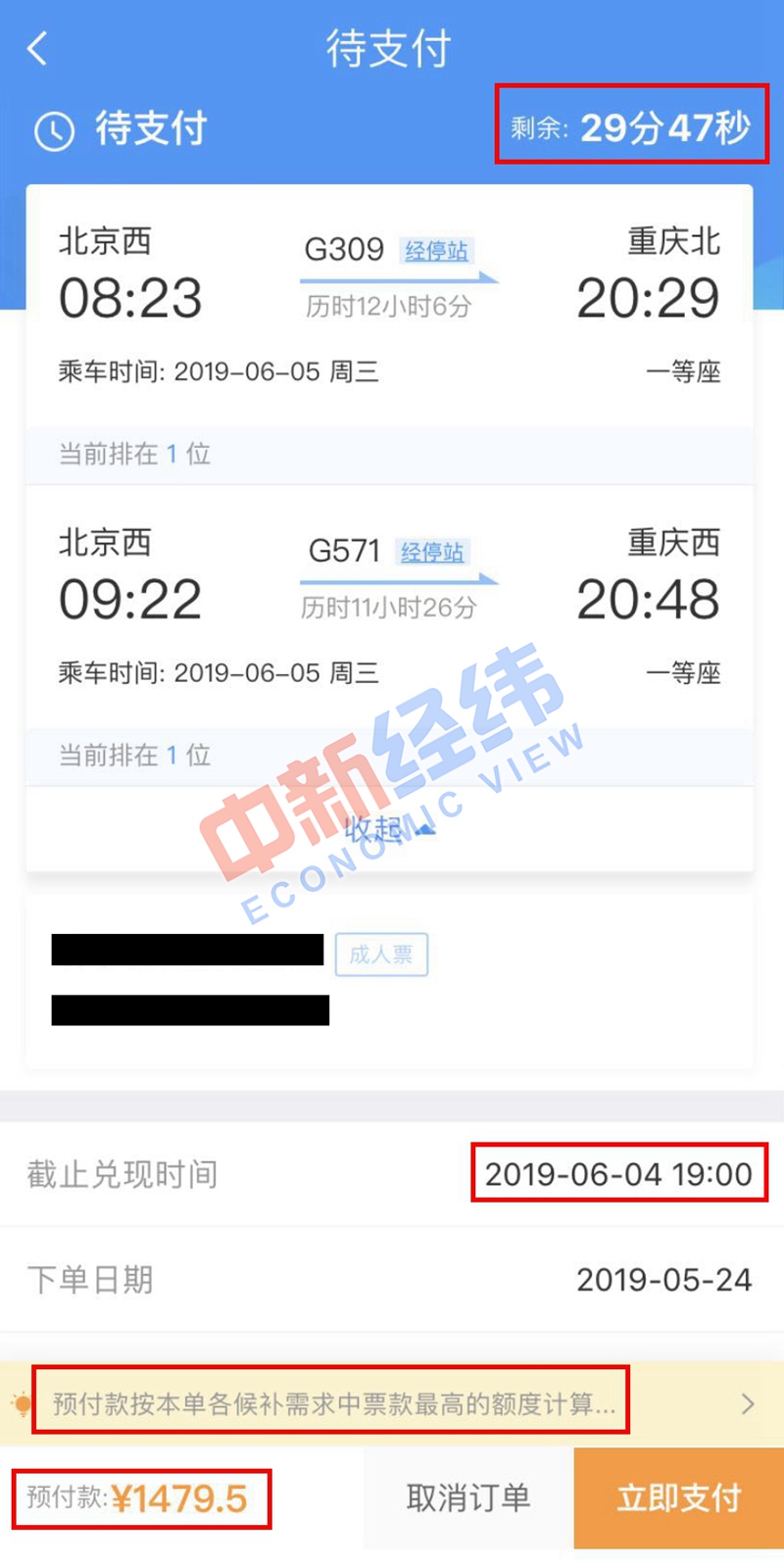 5、信息添加完整以后,就可以提交訂單購買車票了。如果遇到列車晚點,或其中一段停運等原因影響接續(xù)換乘的,退票時將按規(guī)定不收取退票費。