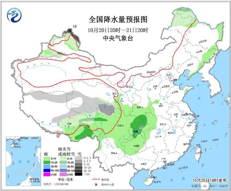 10月20日20時至21日20時,新疆北疆北部和西部、青海南部、西藏北部、內(nèi)蒙古東北部、黑龍江西北部等地的部分地區(qū)有小到中雪或雨夾雪,其中,北疆北部山區(qū)有大到暴雪(10~18毫米)。西藏東南部、陜西南部、四川盆地東部、重慶大部、貴州北部等地的部分地區(qū)有中到大雨(10~40毫米)。內(nèi)蒙古東部、東北地區(qū)北部、新疆北部、西藏北部等地的部分地區(qū)有4~6級風(fēng),新疆山口風(fēng)力可達10級左右(見圖1)。