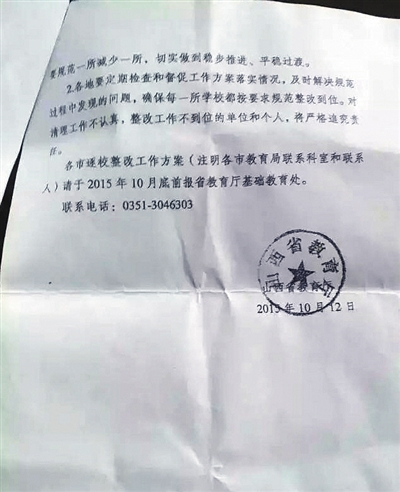 山西省教育廳基礎(chǔ)教育處一名工作人員向新京報記者確認(rèn),上述文件由省廳于2015年10月12日下發(fā),具有行政效力。