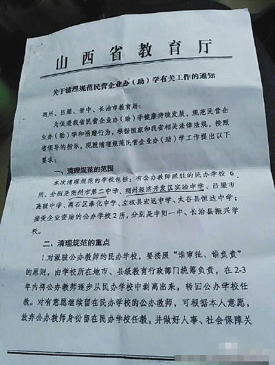 新京報記者看到,文件名為《關(guān)于清理規(guī)范民營企業(yè)辦(助)學(xué)有關(guān)工作的通知》,加蓋有山西省教育廳公章。文件中明確提出,“在2-3年內(nèi)將公辦教師逐步從民辦學(xué)校中剝離岀來,轉(zhuǎn)回公辦學(xué)校任職?!?/p>