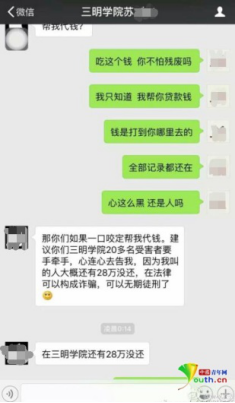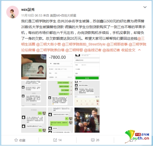 微博截圖 中國青年網(wǎng)北京11月13日(實(shí)習(xí)記者 趙加琪 記者 吳陽)11月10日中國青年網(wǎng)刊發(fā)《95后女大學(xué)生校園貸30萬本金需還50萬 “裸條”被發(fā)至網(wǎng)絡(luò)》,報(bào)道了一名“95后”女生向多個(gè)校園貸平臺借款后,深陷“裸貸”需還50萬。11月13日中國青年網(wǎng)繼續(xù)關(guān)注“校園貸”。 近日福建三明學(xué)院有學(xué)生發(fā)微博稱,自己與多名同學(xué)被誘騙貸款買手機(jī),辦完貸款購機(jī)手續(xù)后,手機(jī)沒拿到卻背了一身債務(wù)。20名大學(xué)生總欠款額度達(dá)20多萬。 11月11日中國青年網(wǎng)記者按照微博指向,聯(lián)系到一位該校學(xué)生黃某。黃某稱自己就是一位受騙者,2015年12月底他在學(xué)校的兼職群里看到了同校學(xué)生蘇某發(fā)布的“招刷單員”的信息,黃某稱當(dāng)時(shí)被蘇某承諾的“待遇高”打動,加之“熟人介紹”,黃某便于蘇某達(dá)成合作。