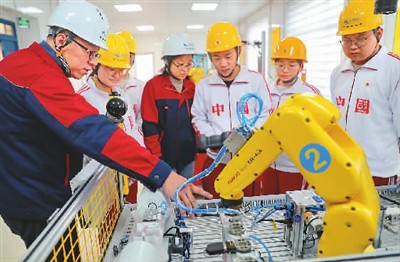 河北建材職業(yè)技術(shù)學(xué)院教師指導(dǎo)學(xué)生進(jìn)行工業(yè)機(jī)器人操作與運(yùn)維1+X職業(yè)等級證書的實(shí)操訓(xùn)練。(曹建雄攝 人民視覺)