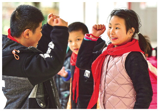 課間操,聽障學(xué)生在玩耍打鬧(2月23日攝)。本報(bào)記者魏培全攝