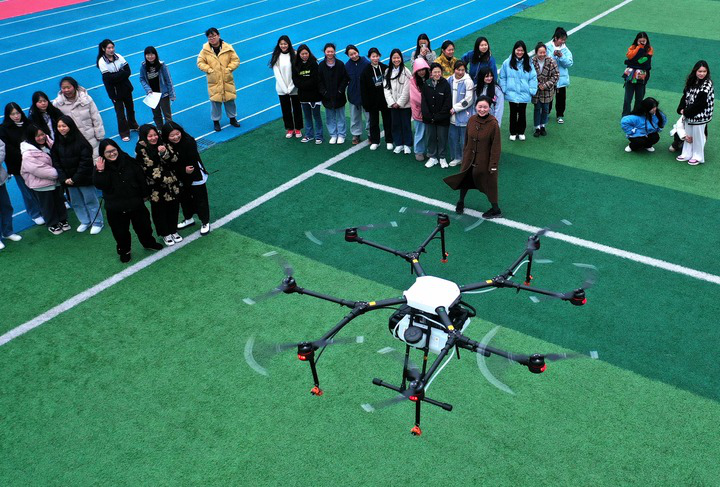 2022年3月2日,在宣恩縣中等職業(yè)技術(shù)學(xué)校,學(xué)生觀摩植保無(wú)人機(jī)飛行操作(無(wú)人機(jī)照片)。新華社發(fā)(宋文攝)
