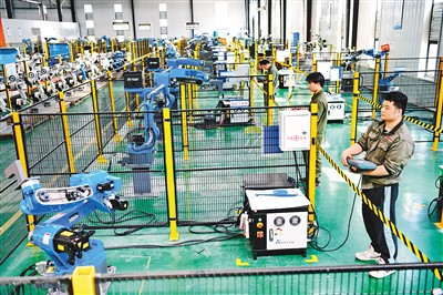 近年來,江西省贛州市加強(qiáng)青年技術(shù)人才技能培訓(xùn),促進(jìn)適齡青年實(shí)現(xiàn)技能成才。圖為贛州市贛縣區(qū)的一家智能裝備制造企業(yè)內(nèi),幾名青年技工在加緊調(diào)試出口的工業(yè)機(jī)器人訂單產(chǎn)品。朱海鵬攝(人民視覺)