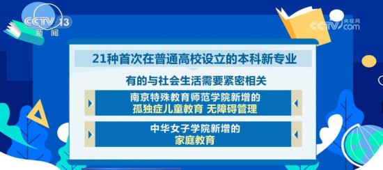 21種首次在普通高校設(shè)立的本科新專業(yè),有的與社會生活需要緊密相關(guān),比如南京特殊教育師范學院新增的孤獨癥兒童教育、無障礙管理,中華女子學院新增的家庭教育;有的與城鄉(xiāng)建設(shè)緊密相關(guān),比如海南大學新增的鄉(xiāng)村治理,北京林業(yè)大學新增的國家公園建設(shè)與管理;還有的與前沿技術(shù)發(fā)展緊密相關(guān),比如,清華大學新增的地球系統(tǒng)科學,華南理工大學新增的生物材料,東南大學新增的未來機器人、電動載運工程。