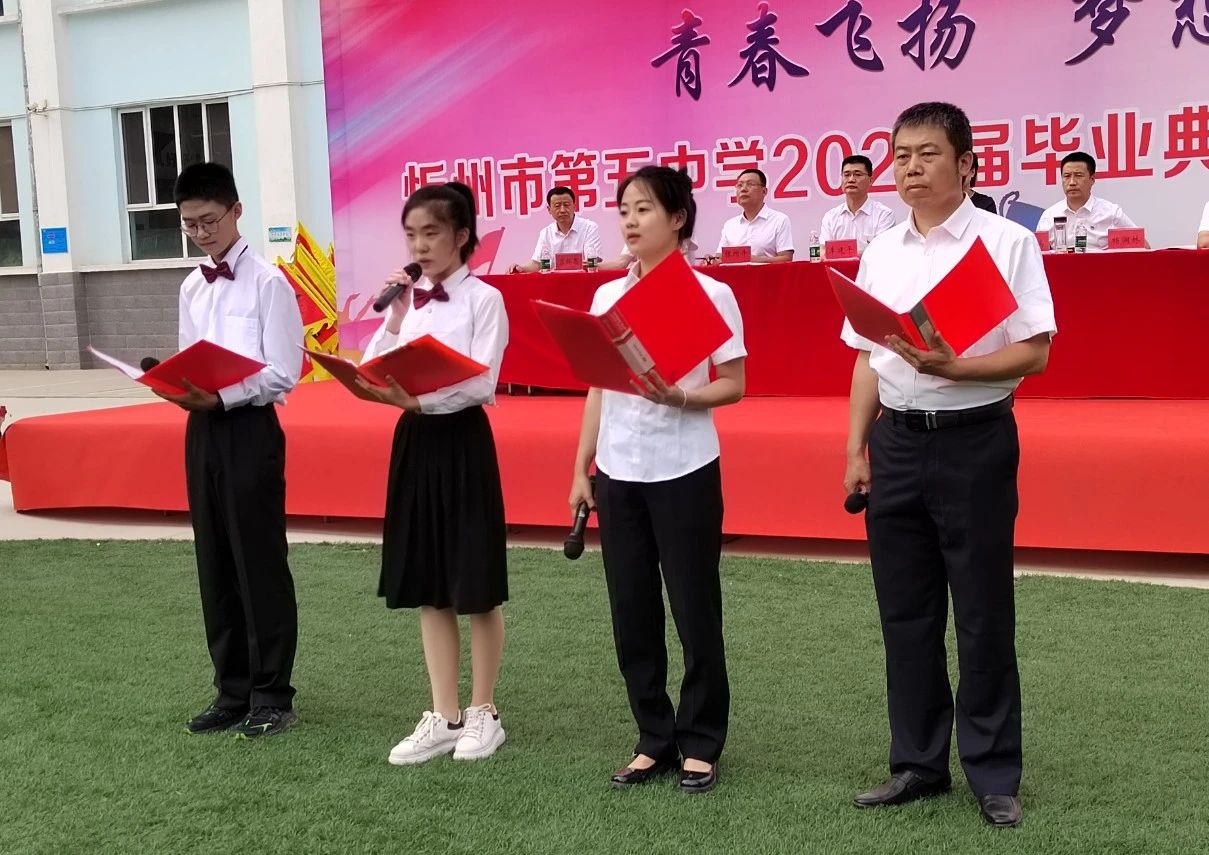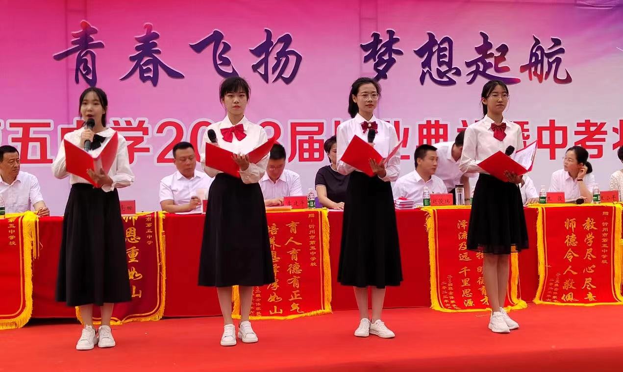 在這分別之際,張倩睿同學宣讀《致母校的一封信》,代表全體初三學子以鏗鏘誓言報答母校的培育之恩:親愛的五中,我的母校,您的關懷和栽培我沒齒難忘,明日我們在陽光下重逢,您會發(fā)展的越來越好,而我也將成為您的驕傲!