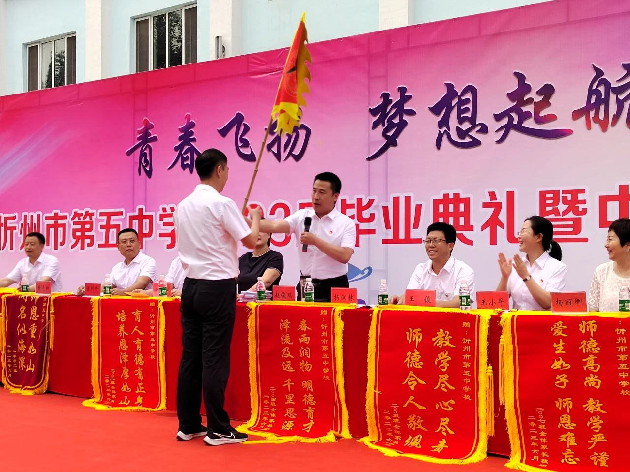 趙校長發(fā)布中考沖鋒,并由董亮田主任授出征旗,三年的征途,是夢想的基石,是光榮的荊棘路,是青春的禮贊,更是未來的希望。祝愿初三學子們六月中考蟾宮折桂,金榜題名,勇奪佳績,再創(chuàng)五中的新輝煌!