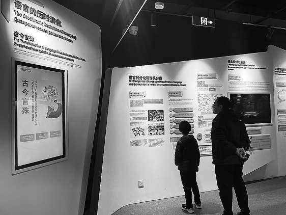 受場(chǎng)地局限,博物館的內(nèi)容陳設(shè)分布在1、2號(hào)兩座館體內(nèi),劃為溯源、傾聽(tīng)、言說(shuō)、書(shū)寫(xiě)、教育、傳播、服務(wù)、探索八大模塊,路徑較為狹長(zhǎng)。而漫步其間,恰好令參觀(guān)者得以按由遠(yuǎn)及近的時(shí)間脈絡(luò),沉浸式感知語(yǔ)言發(fā)展歷程。