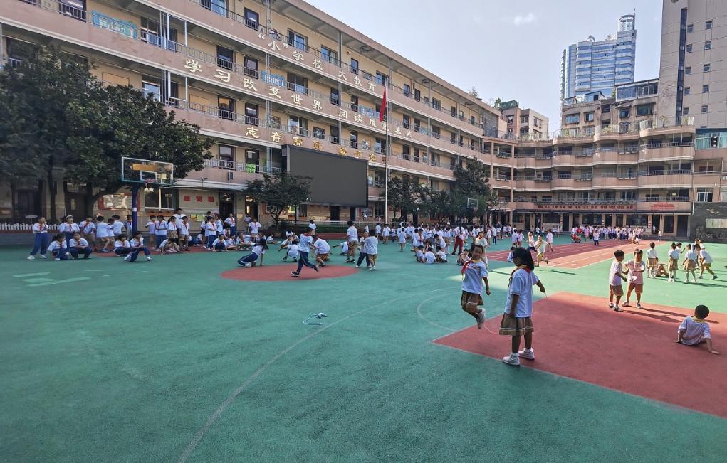 記者在貴陽市第二實驗小學總校區(qū)看到,下課鈴響起后,上千名學生涌出教學樓,到操場上玩耍。他們有的打乒乓球,有的做游戲,有的奔跑嬉戲,有的在圖書角看書,歡笑聲、嬉戲聲在校園里回蕩。