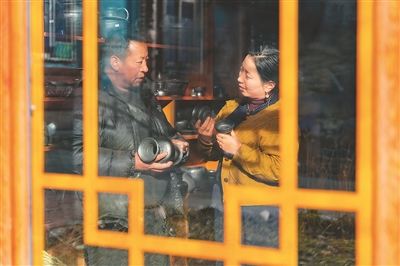 在德格縣麥宿鎮(zhèn)的扎堪倉黑陶工坊,達(dá)瓦卓瑪(右)向工坊主理人降擁格乃了解工坊近期的經(jīng)營(yíng)情況以及新品研制進(jìn)展。新華社記者 沈伯韓攝