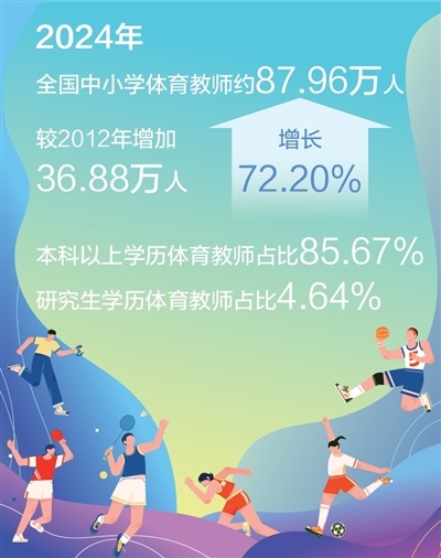 近年來,我國中小學(xué)體育教師隊(duì)伍不斷壯大。2024年全國中小學(xué)體育教師約87.96萬人,較2012年增加36.88萬人,增長72.20%。特別是近5年,全國體育教師數(shù)量增速明顯,師資補(bǔ)充力度加大。