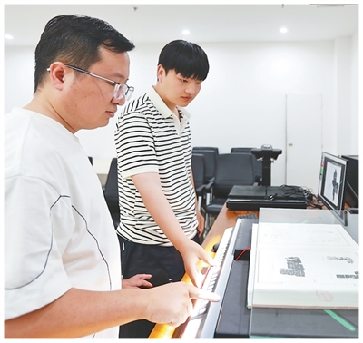 實(shí)驗(yàn)室內(nèi),張展(左)正在和學(xué)生掃描錄入甲骨文拓本?;魜喥綌z