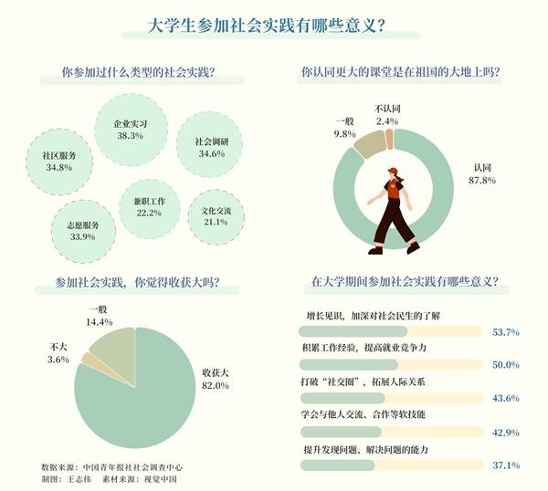 參與實(shí)地調(diào)研,開展支教服務(wù),進(jìn)入企業(yè)實(shí)習(xí)……這個(gè)夏天,不少大學(xué)生選擇用社會(huì)實(shí)踐作為暑假的打開方式。日前,中國(guó)青年報(bào)社社會(huì)調(diào)查中心聯(lián)合問卷網(wǎng)(wenjuan.com)發(fā)布的一項(xiàng)有1000名大學(xué)生參與的調(diào)查顯示,82.0%的受訪大學(xué)生認(rèn)為參加暑期社會(huì)實(shí)踐收獲大。對(duì)于參加社會(huì)實(shí)踐的意義,53.7%的受訪大學(xué)生認(rèn)為能增長(zhǎng)見識(shí),加深對(duì)社會(huì)民生的了解,50.0%的受訪大學(xué)生認(rèn)為能積累工作經(jīng)驗(yàn),提高就業(yè)競(jìng)爭(zhēng)力。87.8%的受訪大學(xué)生認(rèn)同,更大的課堂是在祖國(guó)的大地上。
