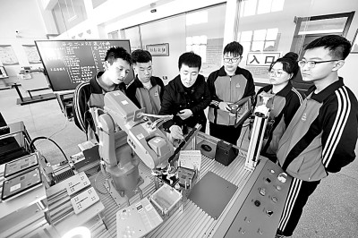 2023年3月28日,在河北省興隆縣職教中心,學(xué)生正進(jìn)行工業(yè)機(jī)器人應(yīng)用實(shí)訓(xùn)。 新華社發(fā)