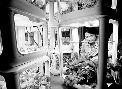 2023年5月13日,上海職業(yè)教育活動(dòng)周,上海農(nóng)林職業(yè)技術(shù)學(xué)院的教師展示智能種植箱里的綠植。 新華社發(fā)