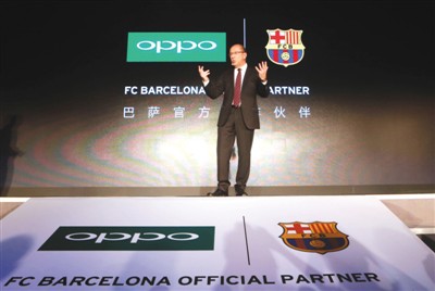 去年9月8日,西甲巴塞羅那俱樂部與OPPO手機(jī)在北京召開聯(lián)合新聞發(fā)布會(huì),宣布自2015-2016賽季開始,OPPO正式成為巴塞羅那俱樂部官方合作伙伴。圖為巴塞羅那俱樂部副主席佩雷斯在新聞發(fā)布會(huì)上致辭。