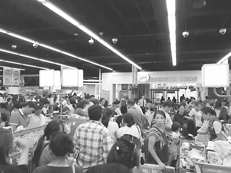 圖片說明: 烏蘭巴托8月初開業(yè)的一家韓國商場(chǎng)收銀臺(tái)前人滿為患,絲毫沒有危機(jī)氛圍。楊濤攝