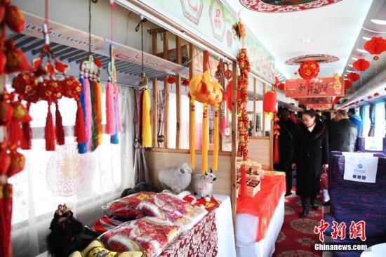 1月13日,春運首日,蘭州鐵路局蘭州客運段擔當?shù)腪6207次列車上設(shè)立“年貨超市”吸引旅客。中新社記者 楊艷敏 攝