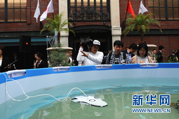 發(fā)布會(huì)場外舉行了PowerRay的水中操作演示。新華網(wǎng)記者 華義 攝