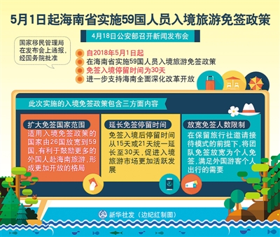“擴(kuò)大免簽國(guó)范圍;延長(zhǎng)免簽停留時(shí)間;放寬免簽人數(shù)限制。”4月18日,公安部在京召開新聞發(fā)布會(huì),國(guó)家移民管理局在發(fā)布會(huì)上通報(bào):經(jīng)國(guó)務(wù)院批準(zhǔn),自2018年5月1日起,在海南省實(shí)施59國(guó)人員入境旅游免簽政策,進(jìn)一步支持海南全面深化改革開放。