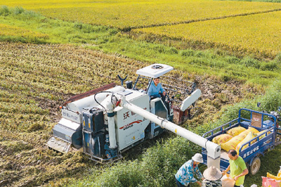 日前,江西省新余市渝水區(qū)羅坊鎮(zhèn)東邊村稻田內(nèi),農(nóng)民駕駛農(nóng)機搶收早稻。趙春亮攝(人民視覺)