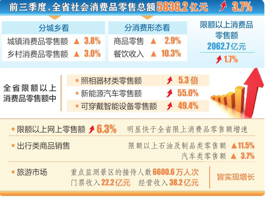 前三季度,全省消費呈現(xiàn)哪些特點。據(jù)省統(tǒng)計局相關(guān)負(fù)責(zé)人介紹,新型消費快速增長,全省限額以上消費品零售額中,照相器材類零售額增長5.3倍,新能源汽車零售額增長55.0%,可穿戴智能設(shè)備零售額增長49.4%。限額以上網(wǎng)上零售額增長6.3%,明顯快于全省限上消費品零售額增速;出行類商品銷售帶動明顯,全省限額以上石油及制品類零售額增長11.5%,汽車類零售額增長3.7%;旅游市場持續(xù)回暖,全省重點監(jiān)測景區(qū)接待人數(shù)6600.6萬人次,門票收入22.2億元,經(jīng)營收入38.2億元,皆實現(xiàn)增長。