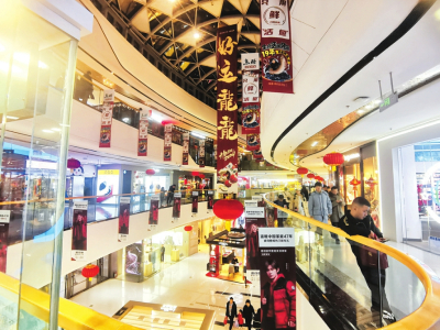 晚上6時30分,走進省城龍湖萬達廣場,遠遠的,霓虹燈閃爍,商場內(nèi)的喜慶裝飾讓人眼花繚亂,“龍運當頭”“龍年大吉”“金龍賀歲”等祝福語隨處可見,各個商家門頭上設置的龍年掛飾為節(jié)日氛圍增色添彩,很多商品無論外形還是包裝,都巧妙地融入了龍年的獨特元素,市民們踏著歡快的新春背景音樂,挑選著年貨賀禮。