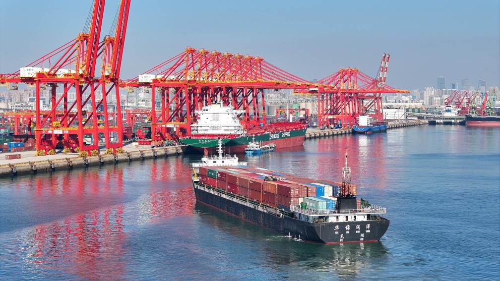 在山東港口日照港,貨輪停泊集裝箱碼頭裝卸作業(yè)(1月10日攝,無人機照片)。新華社記者 郭緒雷 攝