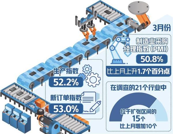 “3月份PMI指數(shù)大幅回升,且重回榮枯線之上,既有季節(jié)性因素影響,也表明經(jīng)濟(jì)回升向好態(tài)勢(shì)進(jìn)一步明確?!眹?guó)務(wù)院發(fā)展研究中心研究員張立群表示。