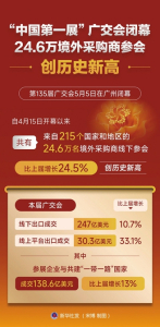 第135屆廣交會(huì)5日在廣州閉幕。自4月15日開幕以來,共有來自215個(gè)國(guó)家和地區(qū)的24.6萬(wàn)名境外采購(gòu)商線下參會(huì),比上屆增長(zhǎng)24.5%,創(chuàng)歷史新高。本屆廣交會(huì)線下出口成交247億美元,線上平臺(tái)出口成交30.3億美元,分別比上屆增長(zhǎng)10.7%和33.1%。