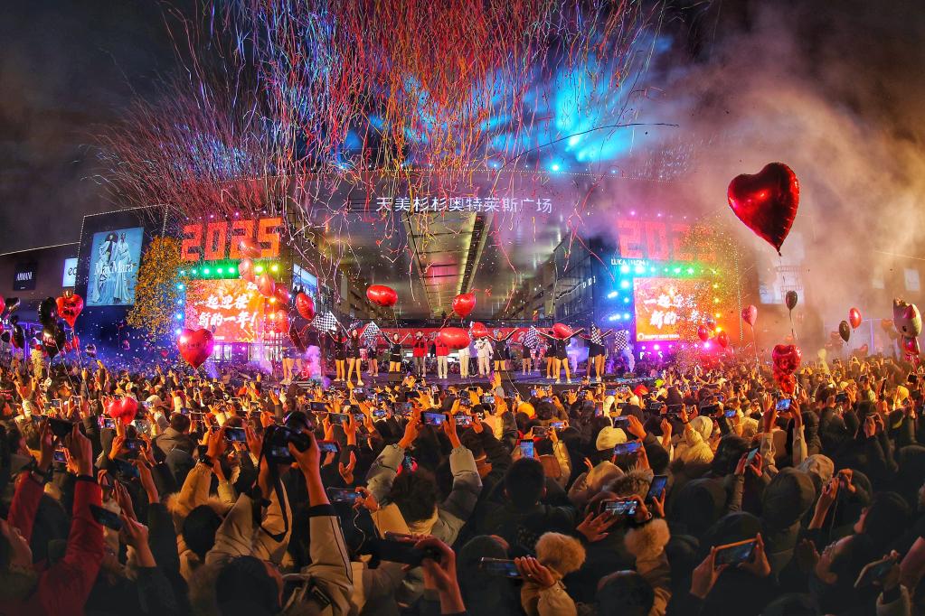 “五、四、三、二、一!”晉中天美杉杉奧特萊斯購物廣場的88臺(tái)高空禮炮噴射彩帶,將跨年夜的氛圍引至高潮。