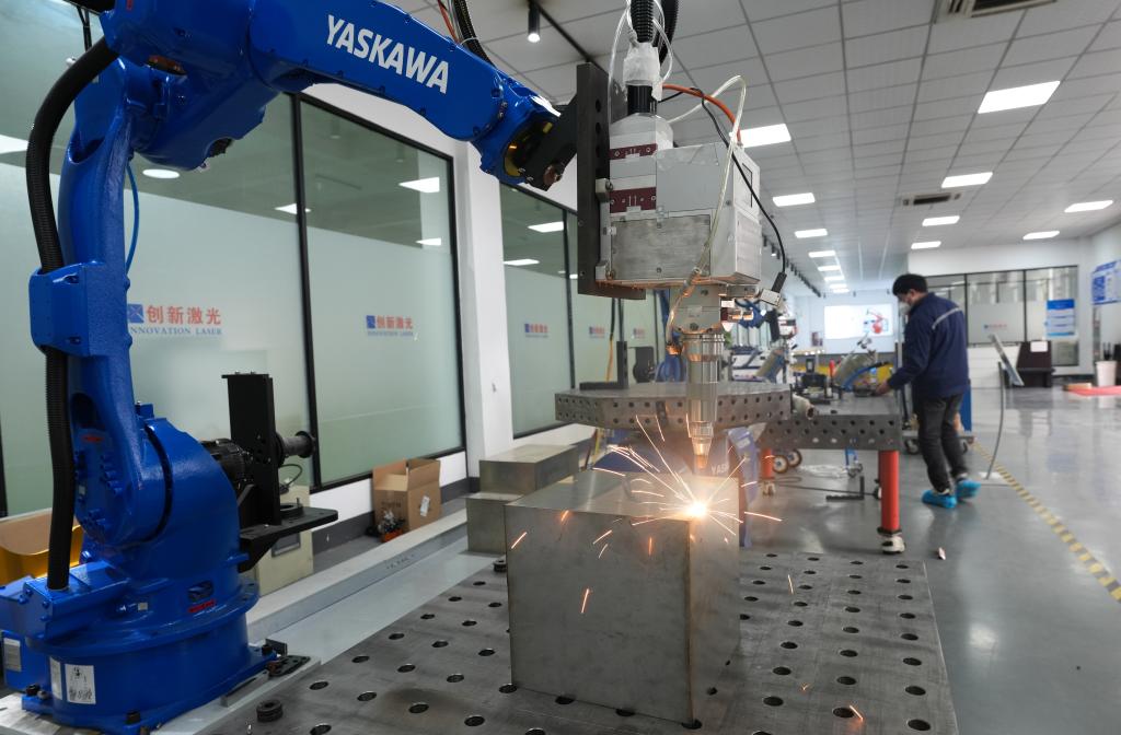 1月7日,紹興市上虞區(qū)浙江創(chuàng)新激光設(shè)備有限公司的機械臂對不銹鋼產(chǎn)品進行無縫激光焊接。 新華社照片,紹興(浙江)(2025年1月7日)新華社記者 翁忻旸 攝
