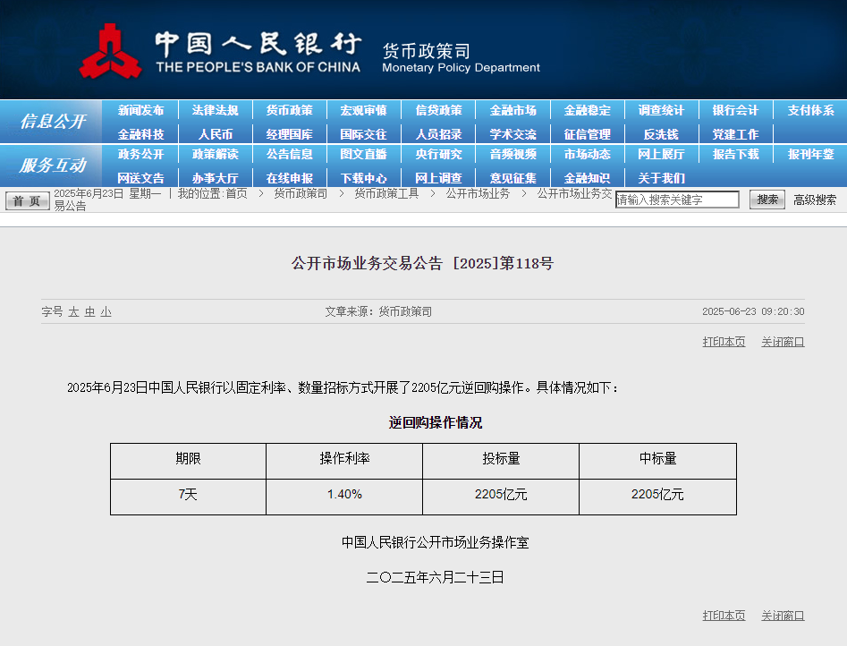 中國(guó)人民銀行官網(wǎng)截圖。 人民網(wǎng)北京6月23日電 (記者羅知之)據(jù)中國(guó)人民銀行網(wǎng)站消息,2025年6月23日中國(guó)人民銀行以固定利率、數(shù)量招標(biāo)方式開(kāi)展了2205億元逆回購(gòu)操作,操作利率1.4%。 (責(zé)任編輯:梁艷) |